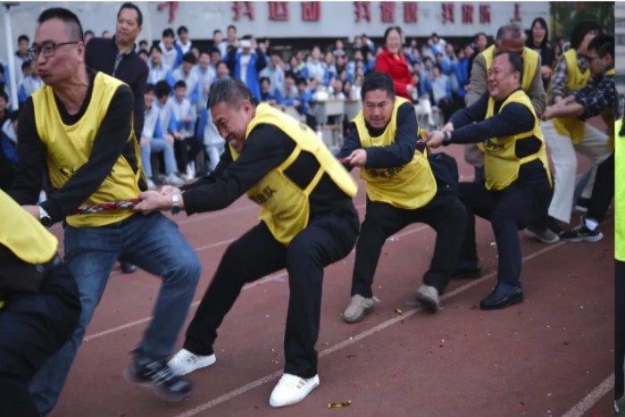 四项趣味项目各具特色:“穿越火线” 中,呼啦圈在师生间流转如飞,考验着衔接的精准与节奏;“飞夺泸定桥” 里,队员们借垫子搭桥渡河,脚沾地时的即刻调整与默契配合,演绎着 “不抛弃、不放弃” 的执着;“同舟共济” 环节,十人手握绳索合力建塔,塔块倾倒后即刻重整旗鼓,展现了容错协作的职场精神;“齐心协力” 拔河赛采用单循环制,6场对决中,9男3女的上场阵容攻防兼备,场间轮换的战术调整与加油声中的咬牙坚持,让赛场成为师德师风的鲜活课堂。