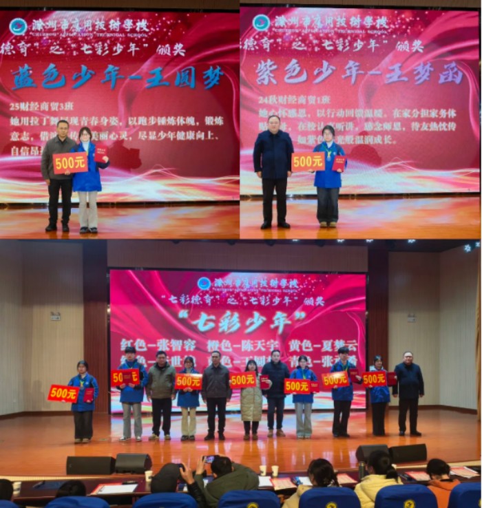 紧接着揭晓校级“七彩少年” 荣誉名单。作为我校 “七彩德育” 育人品牌的核心特色成果,张智荣、陈天宇、夏梦云、李世燕、王园梦、张承希、王梦涵7名同学分别荣获红、橙、黄、绿、蓝、青、紫七色之七彩少年称号,他们以行动诠释青春担当,用热爱书写成长篇章,是我校“七彩德育”多元育人理念结出的丰硕果实,更是我校立德树人成效的生动缩影。