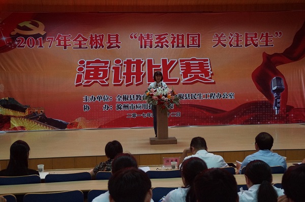 9月22日下午,由县民生办,县教体局主办,滁州市应用技术学校协办的全椒县2017年“情系祖国 关注民生”主题演讲比赛在滁州市应用技术学校顺利举办,出席本次比赛的有全椒县教体工委委员、副局长李慧,县民生办副主任陈亚平,以及县教体局资助中心负责人和全县五所高中学校资助中心主任等。