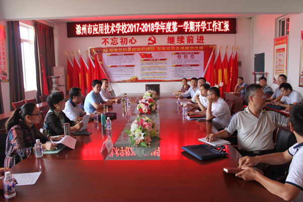 为了全面掌握和了解新学期学校开学及教育重点工作落实情况,切实维护教育系统安全稳定的良好局面,2017年9月8日上午,滁州市教体局检查组在市职成科负责人蒋新华等领导的带领下,莅临滁州市应用技术学校进行2017年秋季开学工作检查。全椒县教体局局长彭守江、副局长范大松及相关股室领导陪同检查。滁州市应用技术学校校长吴雪峰及相关处室负责人参加迎检工作。校长吴雪峰进行了开学工作汇报。